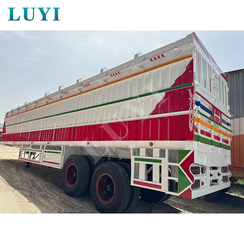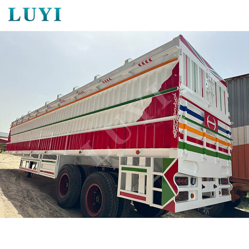 Luyi 2 軸 100 トン ステーク セミトレーラーは、中国山東省発の真新しい貨物トレーラーで、効率的な重量物輸送用に特別に設計されています。本体は高張力鋼板を使用しており、耐圧性、耐久性に優れています。最大有効積載量60トンで、バルク品やコンテナを柔軟に輸送し、さまざまな貨物シーンに適応します。