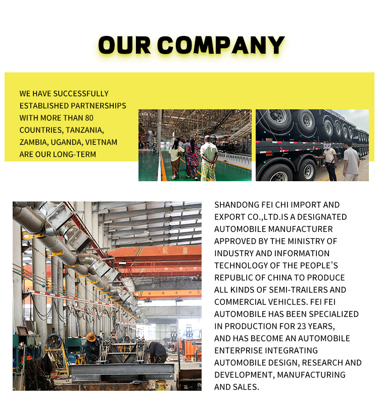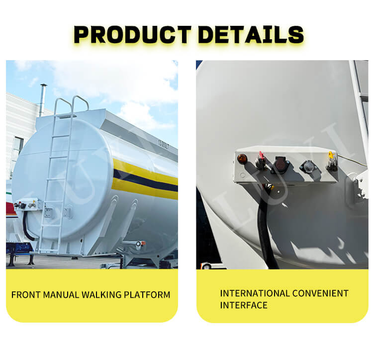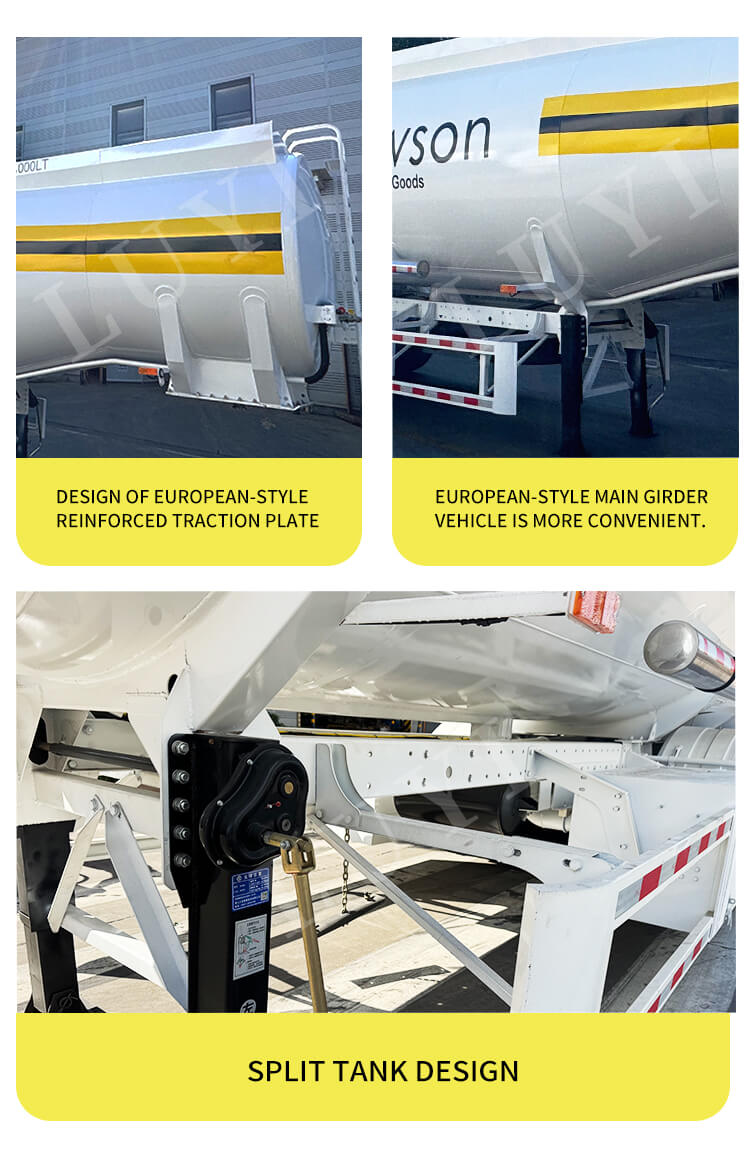 トレーラーは堅牢で信頼性の高い構成を誇ります。 Fuwa、BPW、BERKLEY などのブランドの 13/16 トン アクスルが装備されており、オプションでメカニカル サスペンションまたはエア サスペンションを提供します。 11.00r20、12r22.5、315、385などのさまざまなタイヤ仕様に対応し、安定した走行とさまざまな路面状況への適応性を確保します。標準の 28 トン着陸装置と 50#/90# キングピンが付属しており、便利で安全な操作を実現します。カスタム ボディ カラーをサポートするこの製品は、実用性とパーソナライゼーションを組み合わせて、ディーゼル輸送に安定した柔軟なプロフェッショナル ソリューションを提供します。