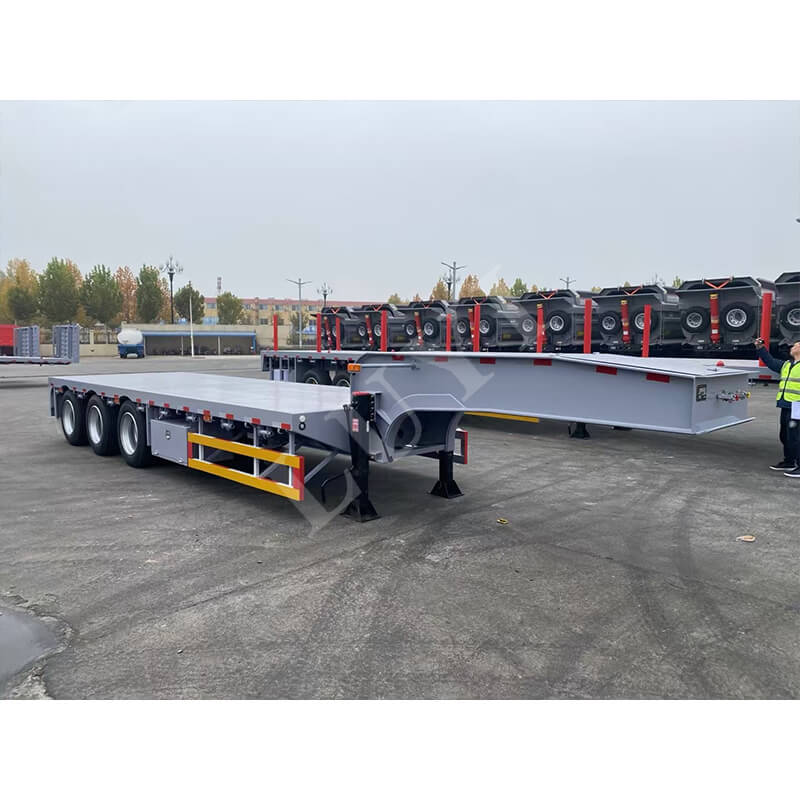 トレーラーの寸法は 11500/12500/13000×3000×1750mm で、カスタマイズも可能です。 90mm(幅)×13/16mm(厚さ)×10層の板バネを搭載しており、アクスルは13/16トンのFUWAブランドから選択可能で、安定した確実な作動を実現します。ブレーキ システムはリレー バルブを使用して敏感な応答を実現します。キングピンはJOST 2インチ(50mm)または3.5インチ(90mm)仕様で、ランディングギアは操作性の良いJOST 28トン2スピードタイプを採用しています。さまざまな輸送シナリオに合わせて色をカスタマイズできます。