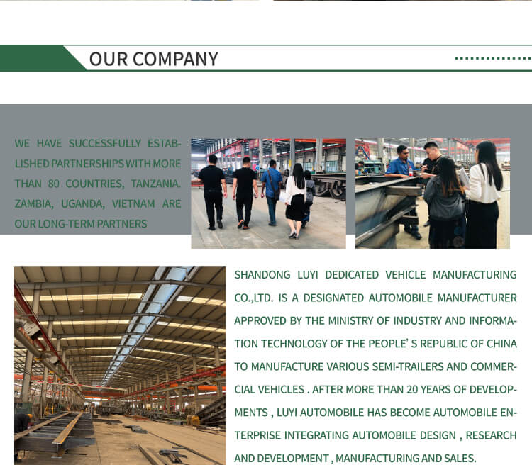 luyiセミトレーラー製造株式会社は、あらゆる種類のセミトレーラー、セメントタンクローリー、石油タンクローリー、ダンプセミトレーラー、コンテナセミトレーラー、フラットパネルセミトレーラー、スケルトンセミトレーラー、納屋セミトレーラー、ローパネルの生産を専門としています。