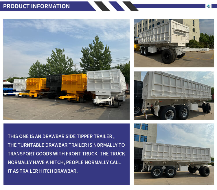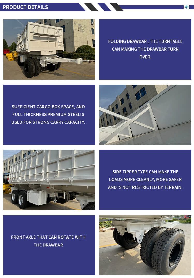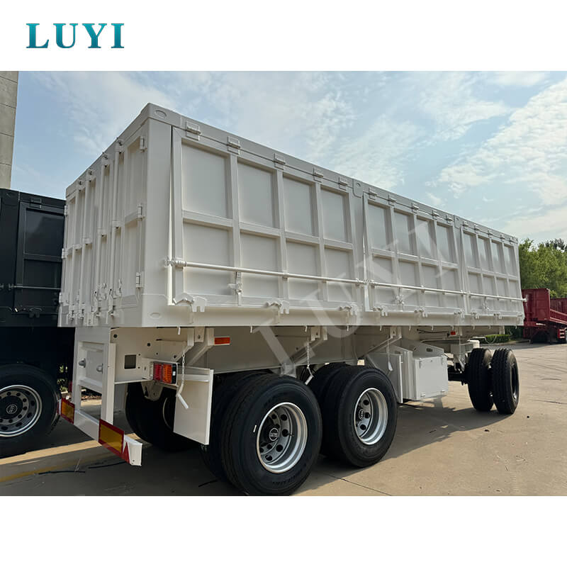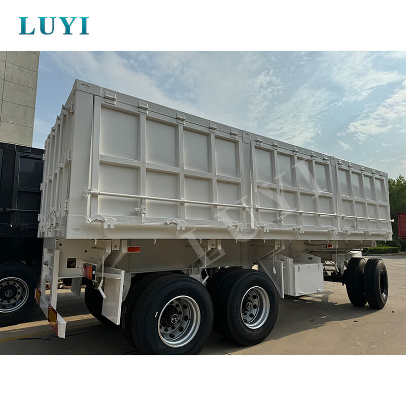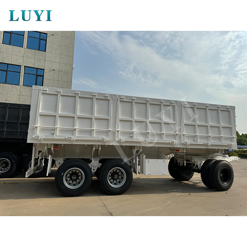 LUYI 3 軸 40 トン貨物輸送トラクター サイドチップ ダンプ トレーラーは、中国山東省発祥で、砂や砂利の輸送用に特別に設計されたフルトレーラー タイプのトラック トレーラーです。トレーラー本体は高張力鋼製で、オプションの 2 ~ 4 軸構成とメカニカル/エア サスペンションと組み合わせられます。 12R22.5タイヤを採用し、安定した耐荷重性と強力な通過性を確保し、最大有効積載量は30000kgを超え、重荷重の要件を容易に満たします。