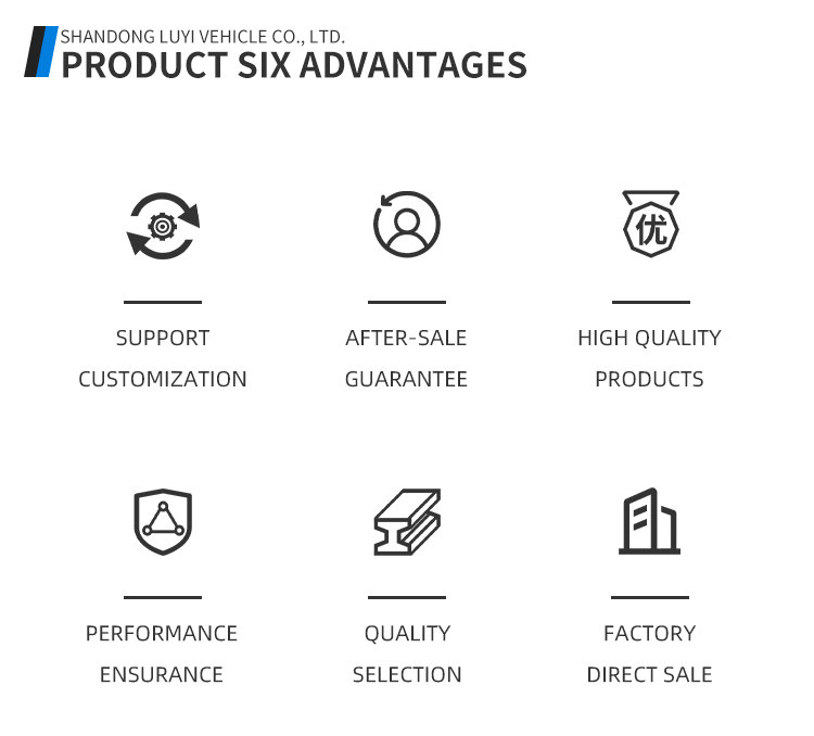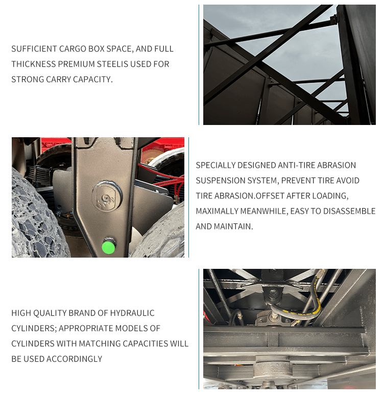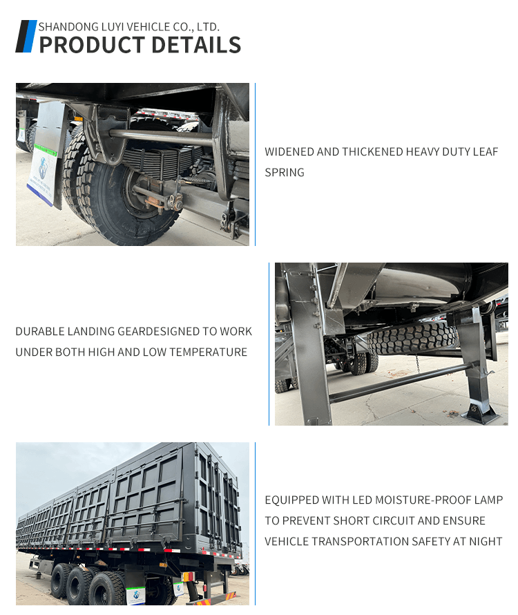 寸法は 11000x2500x3500mm、最大積載量は 25001 ~ 30000kg で、重荷重の要求に効率的に応えます。 90(幅)mm×13(厚さ)mm×10(層)の板バネを採用したメカニカルサスペンションと複列ブレーキシステムを搭載し、安定・安全な作動を実現します。標準の 28Ton ランディングギアと 2 インチ (50mm)/3.5 インチ (90mm) の JOST キングピンが適応性を高めます。色とロゴはカスタマイズできるため、重量物の輸送ニーズに多用途で信頼できる選択肢となります。