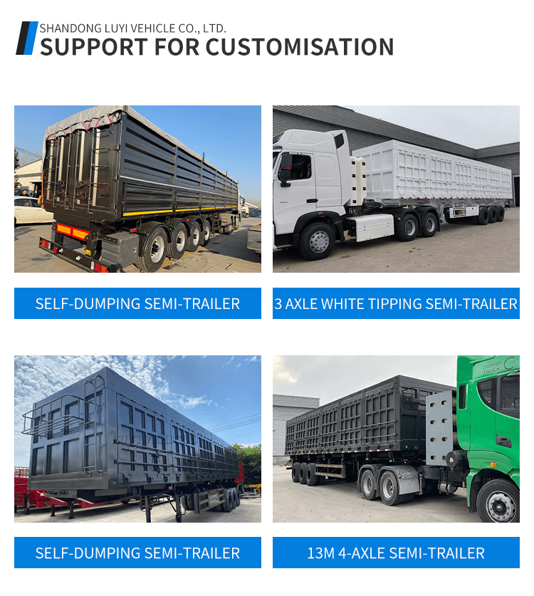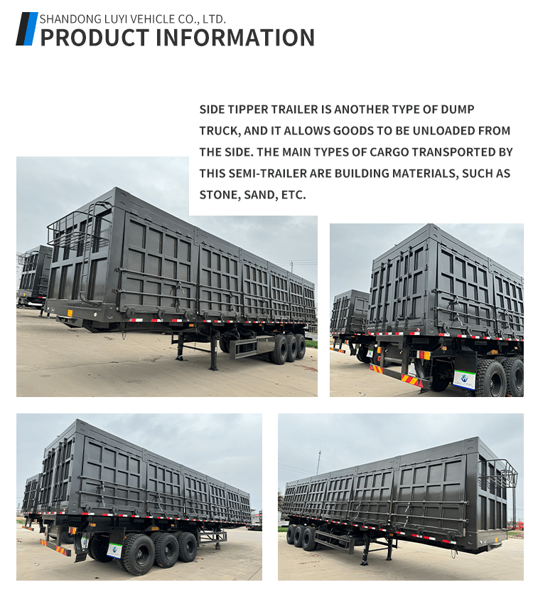 LUYI のこの 3 軸 40 トン サイドチップ ダンプ セミトレーラーは、重量物輸送向けの高性能ソリューションです。中国の山東省で製造され、プレミアムスチールを使用した真新しい構造が特徴で、厳しい輸送条件に耐えられる耐久性を確保しています。
