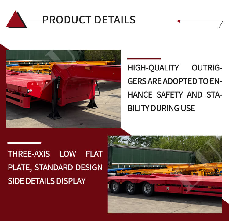 高品質の鋼材を使用したトレーラーのサイズは17000×2500mm、最大積載量は80Tで、重量物機器の搬送も容易に行えます。 12R22.5 タイヤと組み合わせて、さまざまな荷重要求に適応する柔軟なアクスル構成 (2/3/4 アクスル) を提供します。メカニカルサスペンションシステムとエアサスペンションシステムの両方をオプションで選択でき、安定した走行と輸送中の荷物の効果的な保護を保証します。