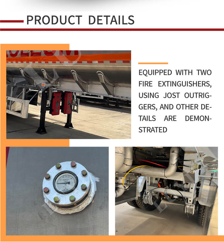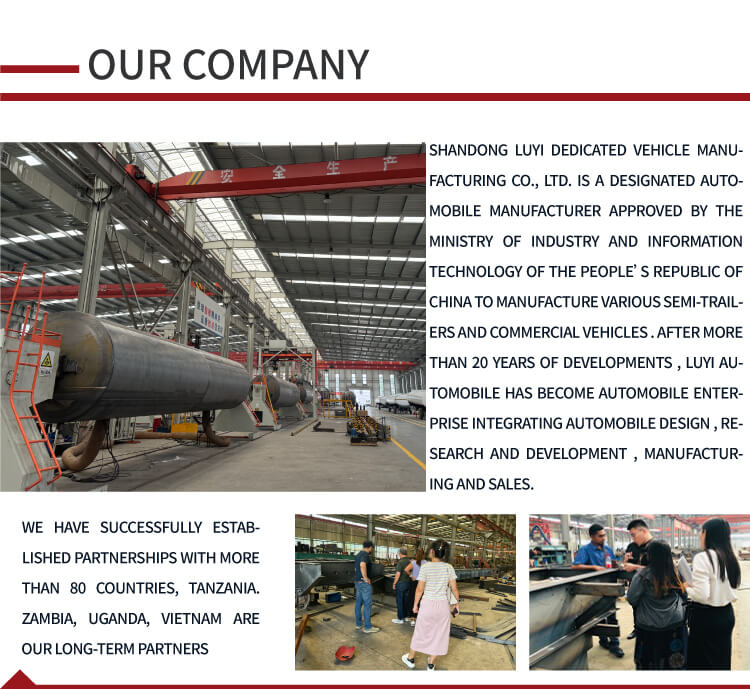 このセミトレーラーには LUYI 4 軸が装備されており、サスペンション システムにはメカニカル サスペンションまたはエア サスペンションのオプションが用意されています。 12R22.5タイヤとの組み合わせで安定した走りを実現します。サポートレッグは標準の28トンクラスで、キングピンは2インチ(50mm)または3.5インチ(90mm)が用意されており、高い適応性を備えています。その色は顧客の要件に応じてカスタマイズでき、実用性と個性を兼ね備えており、燃料輸送分野で理想的な選択肢となっています。