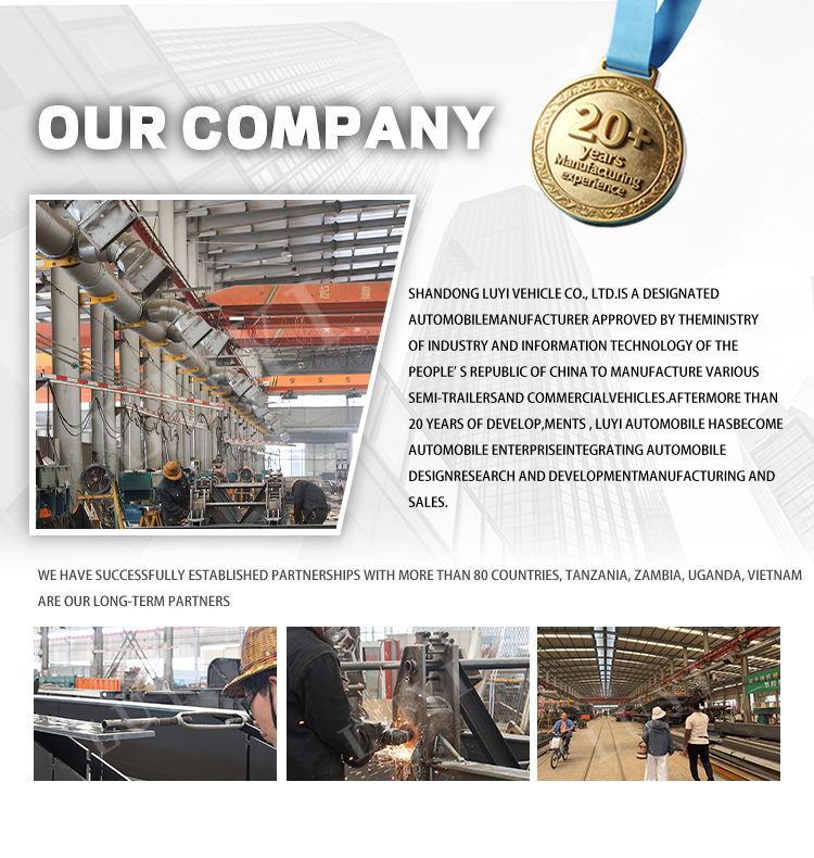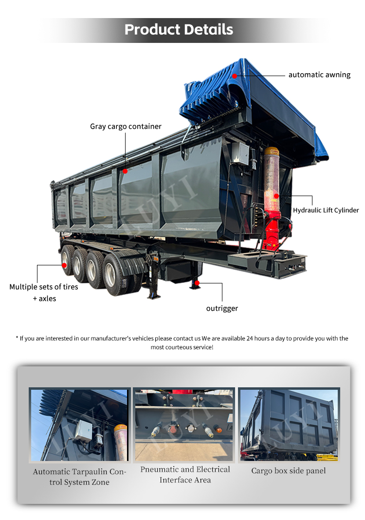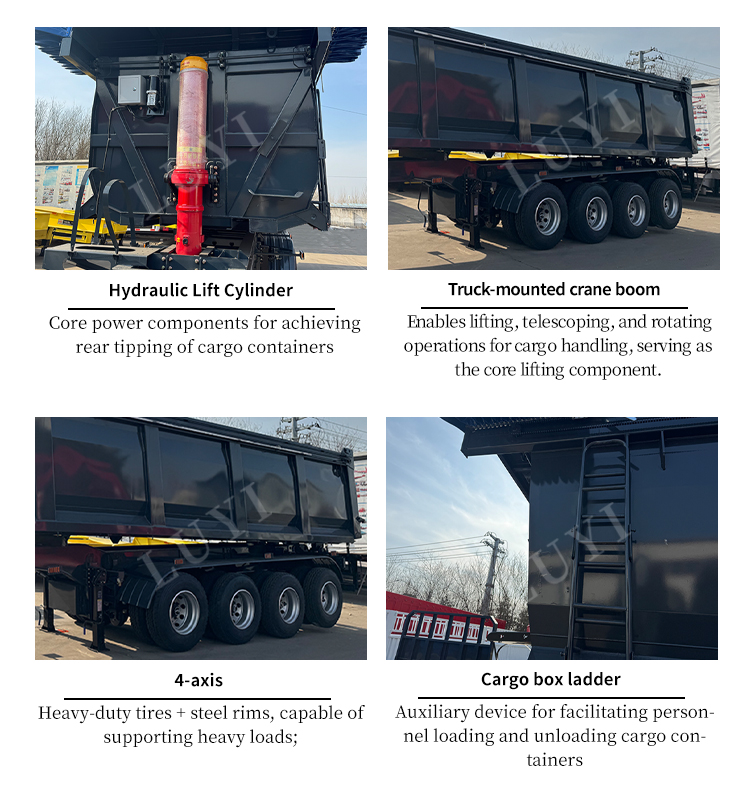 高さ 500mm の Q345 炭素鋼ホイールハブと 70 トンの支持力を持つ強化されたメインビームで構築されており、強力な構造安定性と長寿命を保証します。オプションの4/6アクスル、適合する機械式スプリングまたはエアサスペンションシステム、および11.00R20、12R20、315/80R22.5を含むマルチスペックタイヤで構成され、さまざまな複雑な道路状況でも安定した走行を実現します。油圧シリンダー駆動のU字型ダンプ本体により、迅速かつ効率的な荷降ろしが可能です。顧客の多様な要求に合わせてカスタマイズ可能な色が用意されており、砂、砂利、石炭などのバルク材料の信頼性と耐久性に優れた重量輸送機器となります。