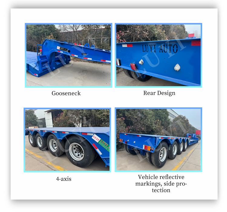 LUYI 4 軸グースネックローベッドセミトレーラーは、中国山東省で生産され、重量貨物輸送用に特別に設計された高品質のセミトレーラーです。高級鋼で作られており、自重はわずか 6,350KG、定格荷重容量は 50,000KG、最大ペイロード範囲は 30T ~ 200T で、優れた耐荷重性能を発揮します。