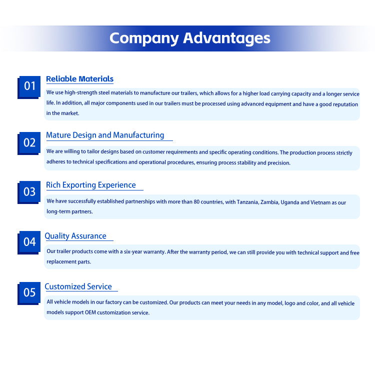 全体寸法 1300030001700mm で、1300030001250mm の大きな荷台を備えています。 3mmダイヤモンドプレートにより滑り止めと耐摩耗性を確保し、安定した貨物輸送を保証します。そのコアコンポーネントには、優れたブレーキ性能と耐久性を実現する 3 セットの 13 トン FUWA アクスルが含まれており、複雑な道路状況に適応する 11.00R20 タイヤと組み合わせられています。 50mm/90mm デュアルスペック トラクション ピンと標準の 28 トン ランディング ギアは、さまざまなトラクション ニーズを満たし、駐車の安定性を確保します。
