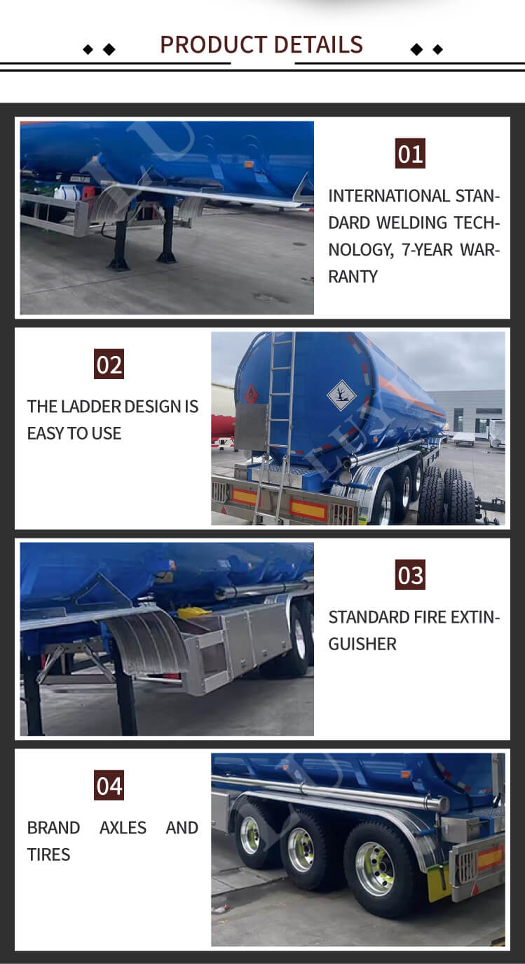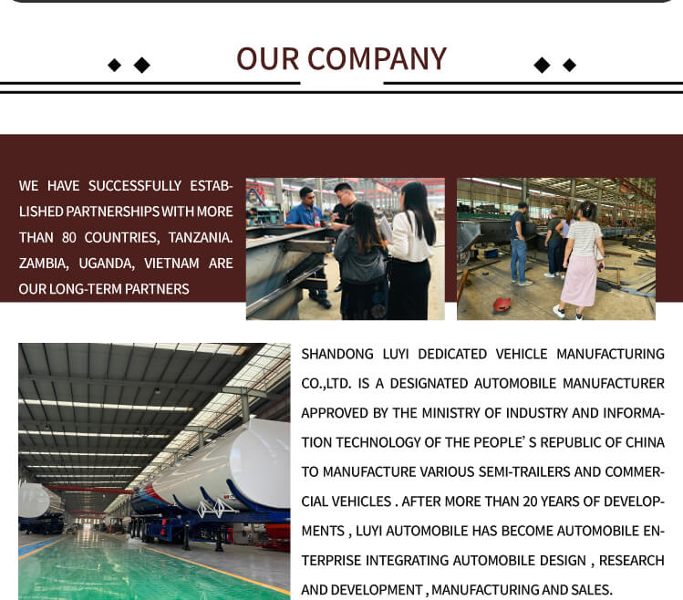 柔軟な構成オプションが特徴です。アクスルは LUYI、FUWA、BPW、または SAF から選択できます。サスペンションは機械式とエア式の両方をサポートします。タイヤは 12R22.5、12.00R20、または 11R22.5 仕様からお選びいただけます。 JOST 標準の 28 トン着陸装置と 2 インチ (50mm)/3.5 インチ (90mm) のキングピン、さらに 90×13×10mm の板バネを備えたトレーラーは、信頼性の高いパフォーマンスを提供します。カスタマイズ可能なカラーは多様なブランディング ニーズに対応し、6 年間の保証は LUYI の品質への取り組みを強調します。中国の山東省で生まれたこのタンクトレーラーは、燃料物流やインフラプロジェクトに最適です。