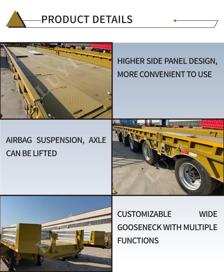 トレーラーは、安定した走行のための信頼性の高いエアサスペンションシステムを備え、13/16 トン Fuwa/BPW/CIMC アクスルと柔軟なタイヤ オプション (11.00r20、12r22.5、315、385) を組み合わせています。 28 トンの標準着陸装置、JOST D200T サポートレッグ、トラクターを確実に接続するための 2.0 インチ (50mm)/3.5 インチ (90mm) のキングピンが装備されています。デュアルラインブレーキシステムは安全性を確保し、色はカスタマイズ可能で、耐久性があり、重量物の輸送に適した選択肢となります。