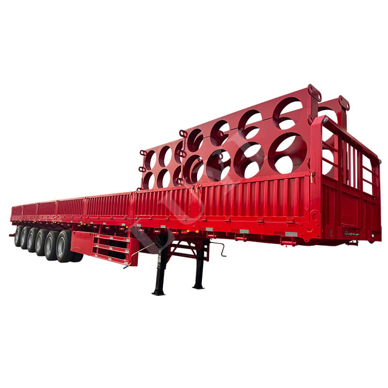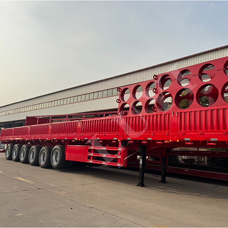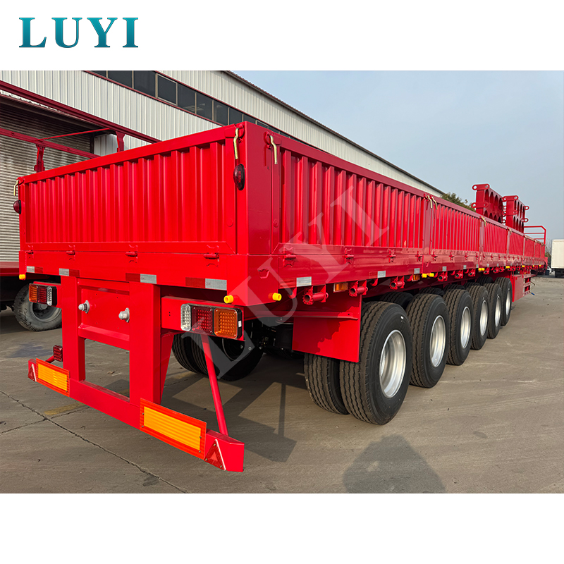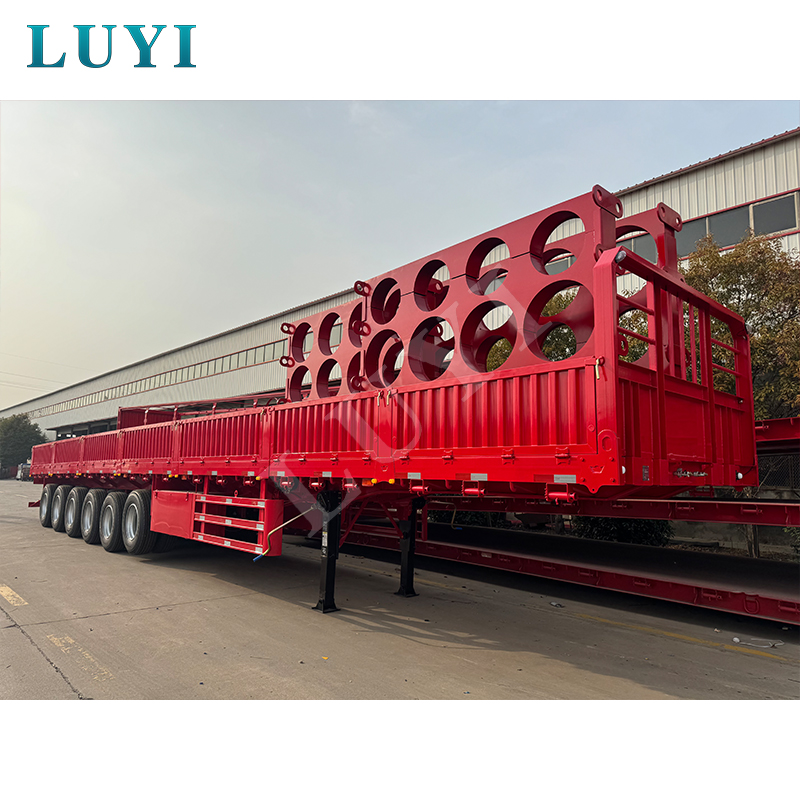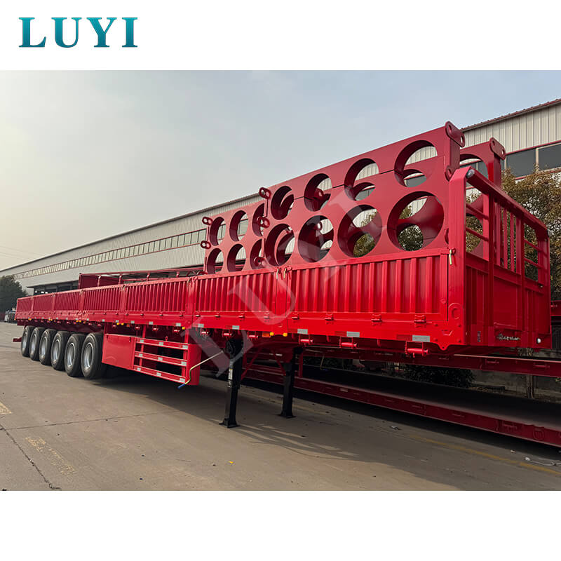 LUYI 6 軸 15.5 メートル 80-100 トン 40 フィート サイドウォール セミトレーラーは、杭型/フラットベッド セミトレーラーとも呼ばれ、中国山東省で生まれました。コンテナやバルク貨物の輸送用に設計された高品質のセミトレーラーです。全鋼製で、寸法は15500×2500×1600mm、最大有効積載量は60~100トンで、強力な耐荷重能力を誇り、重量物の輸送ニーズに容易に対応します。