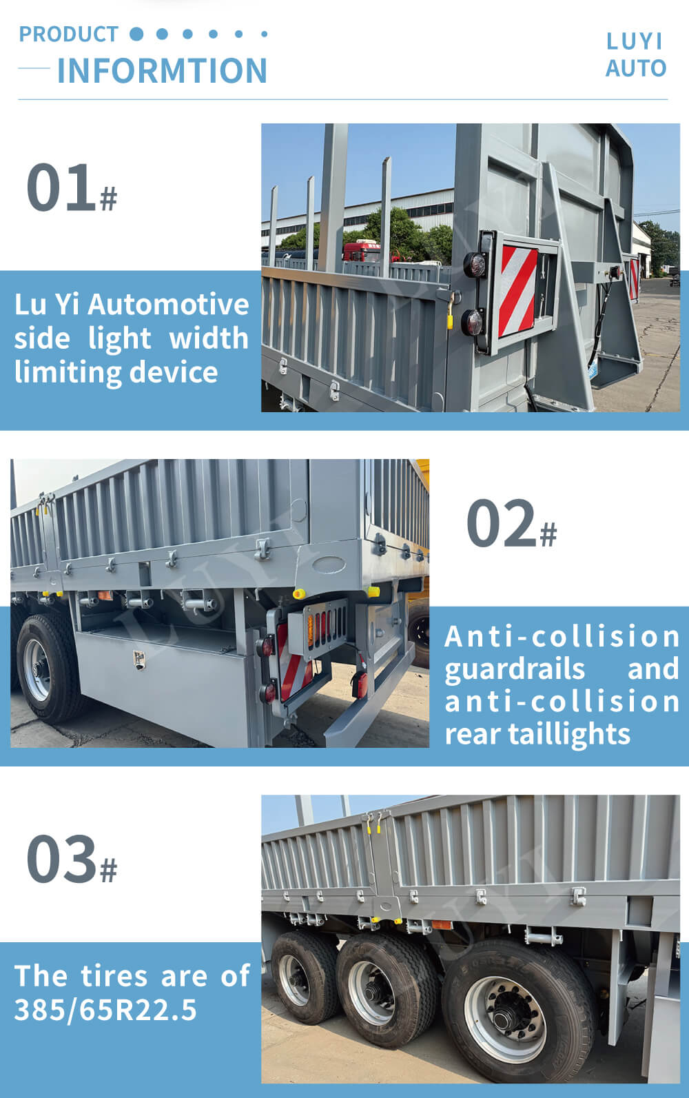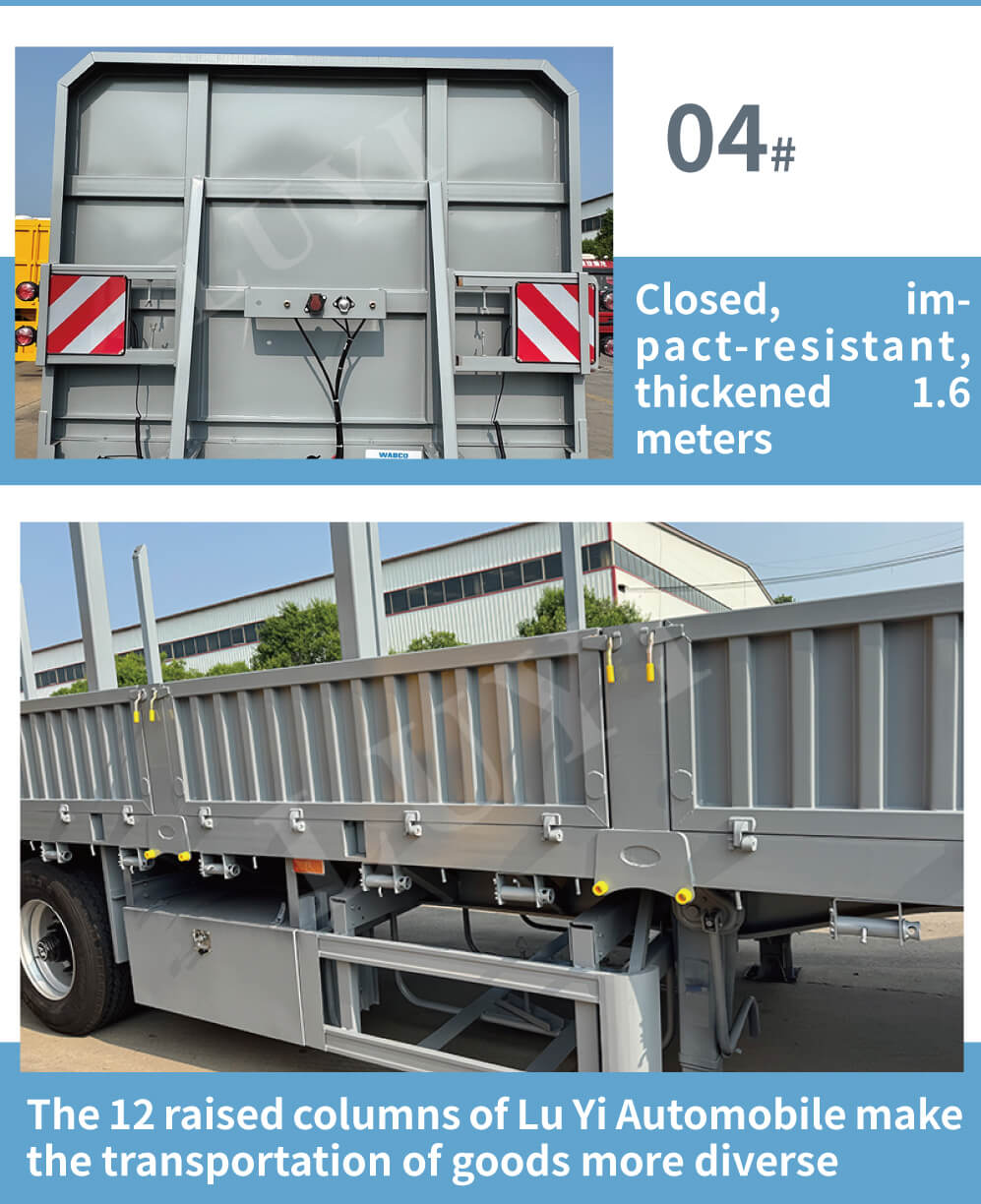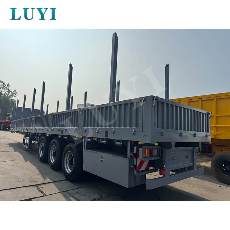 中国山東省に拠点を置くブランド、LUYI のコラム付き 3 軸サイドウォールセミトレーラーは、バルク貨物やコンテナ輸送に最適です。高品質の鋼材で作られており、12500x2500x1600mm の正確な寸法と最大積載量 60 トンを備えており、その強力な支持能力により、さまざまな重量輸送ニーズに簡単に対応できます。