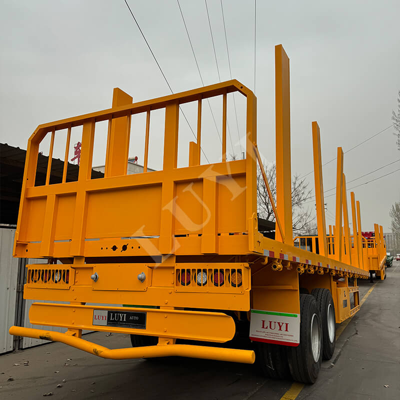 LUYI の 2 軸 40 トン コラム フラットベッド トレーラーは、広範なカスタマイズ オプションを備えた木材輸送用に調整されています。丸太、製材、その他の木製品に合わせてサイドボードの高さを調整し(30~80cmが利用可能)、グリップ力を高めるためにチェッカープレートスチールまたは滑り止めコーティングされたデッキからお選びください。